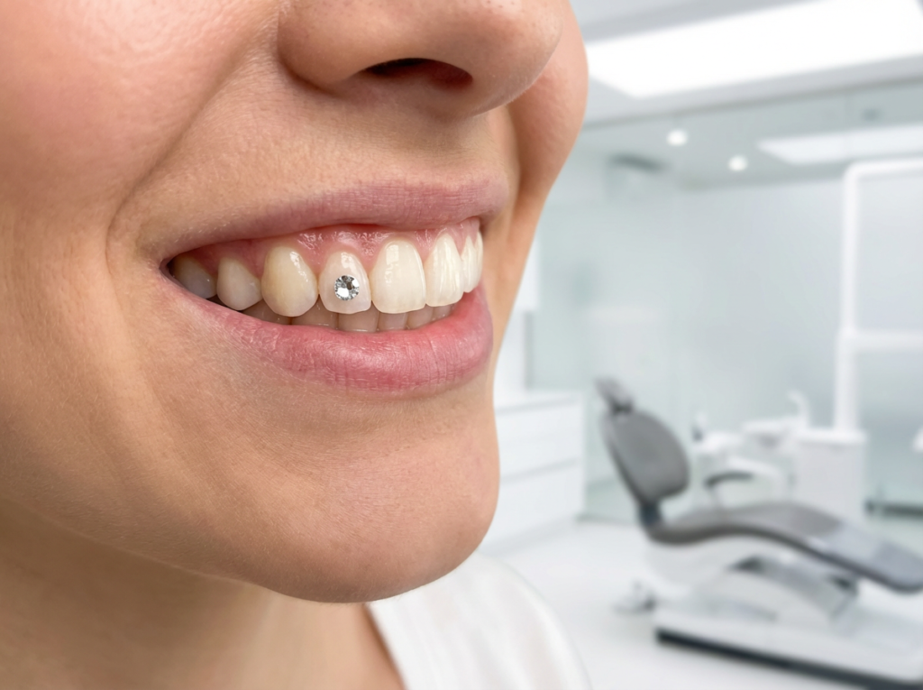 Enhances smile aesthetics with carefully placed decorative dental accessories designed for a subtle, stylish look.